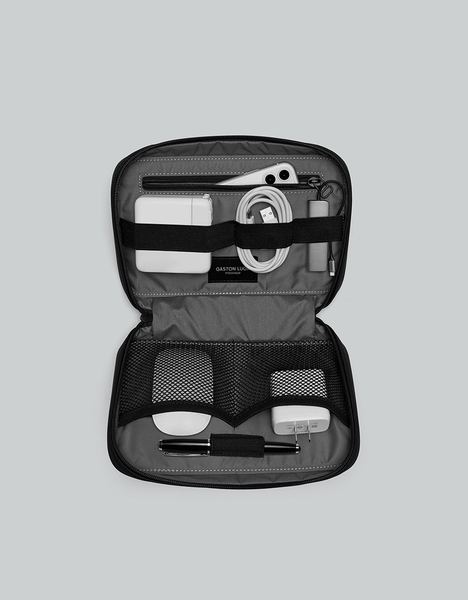 Keep your tech essentials neatly organised with the Gaston Luga D�sh Tech Organiser. Made from waterproof recycled materials, it offers multiple compartments for cables, chargers, and small accessories � ideal for travel, commuting, or daily work setups. Key Feauters: - Eco-friendly recycled polyester with waterproof PU coating - Waterproof protection up to 8000mm - Multiple elastic loops and pockets for organisation - Compact and lightweight - Durable and easy to carry - Modern minimalist look
